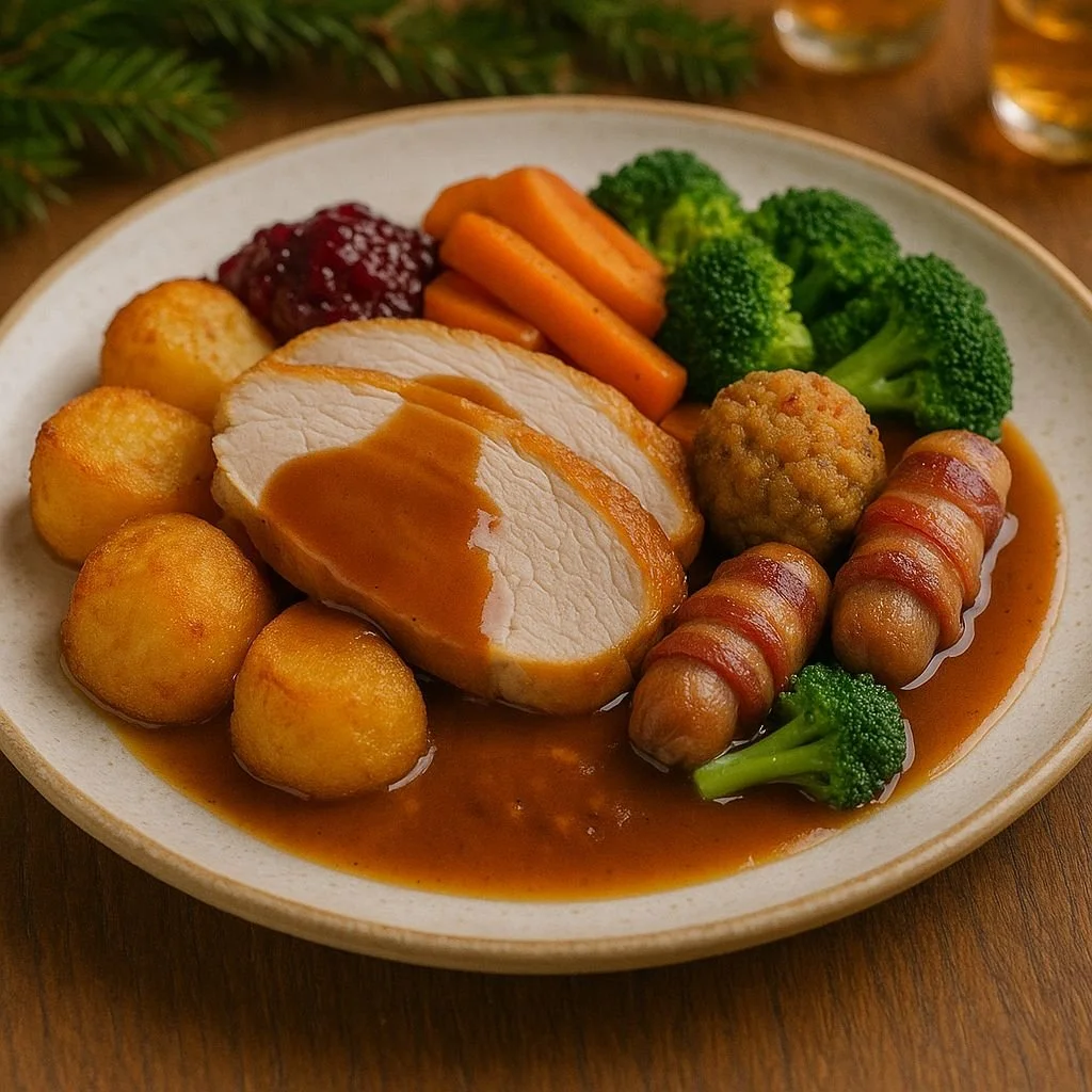 Roast Turkey with all the Trimmings: Juicy slices of roast turkey paired with crispy roast potatoes, buttered vegetables, and savoury stuffing. Accompanied by pigs in blankets, tangy cranberry, and velvety gravy.